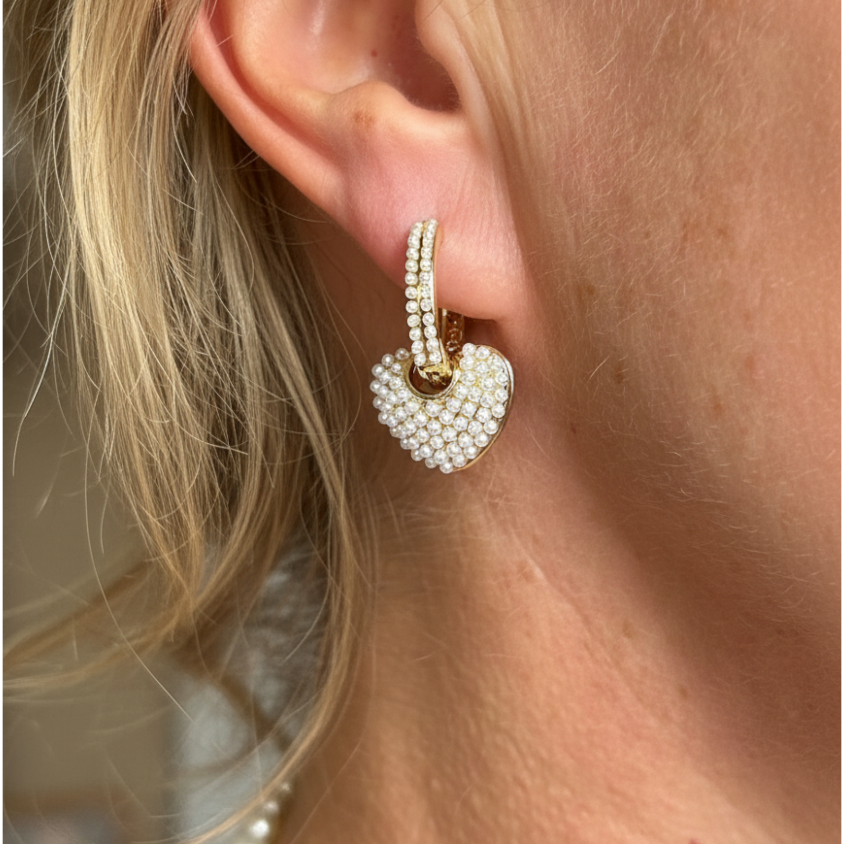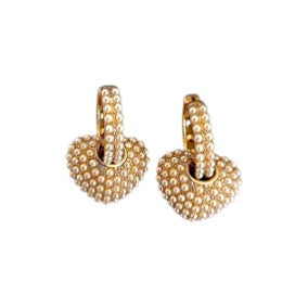 Korvakorujen yläosaa koristaa helmiäishelmirivistö, joka kehystää kasvot kauniisti ja luo harmonisen kokonaisuuden sydänriipuksen kanssa. Muotoilu on samaan aikaan näyttävä ja siro – täydellinen valinta niin juhlaan kuin arjen tyylikkääksi katseenvangitsijaksi.