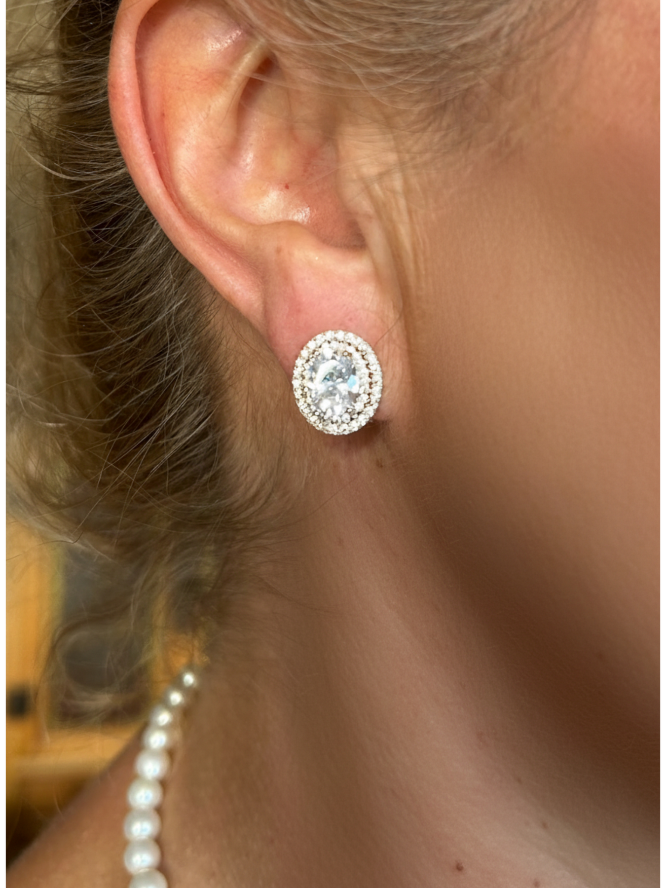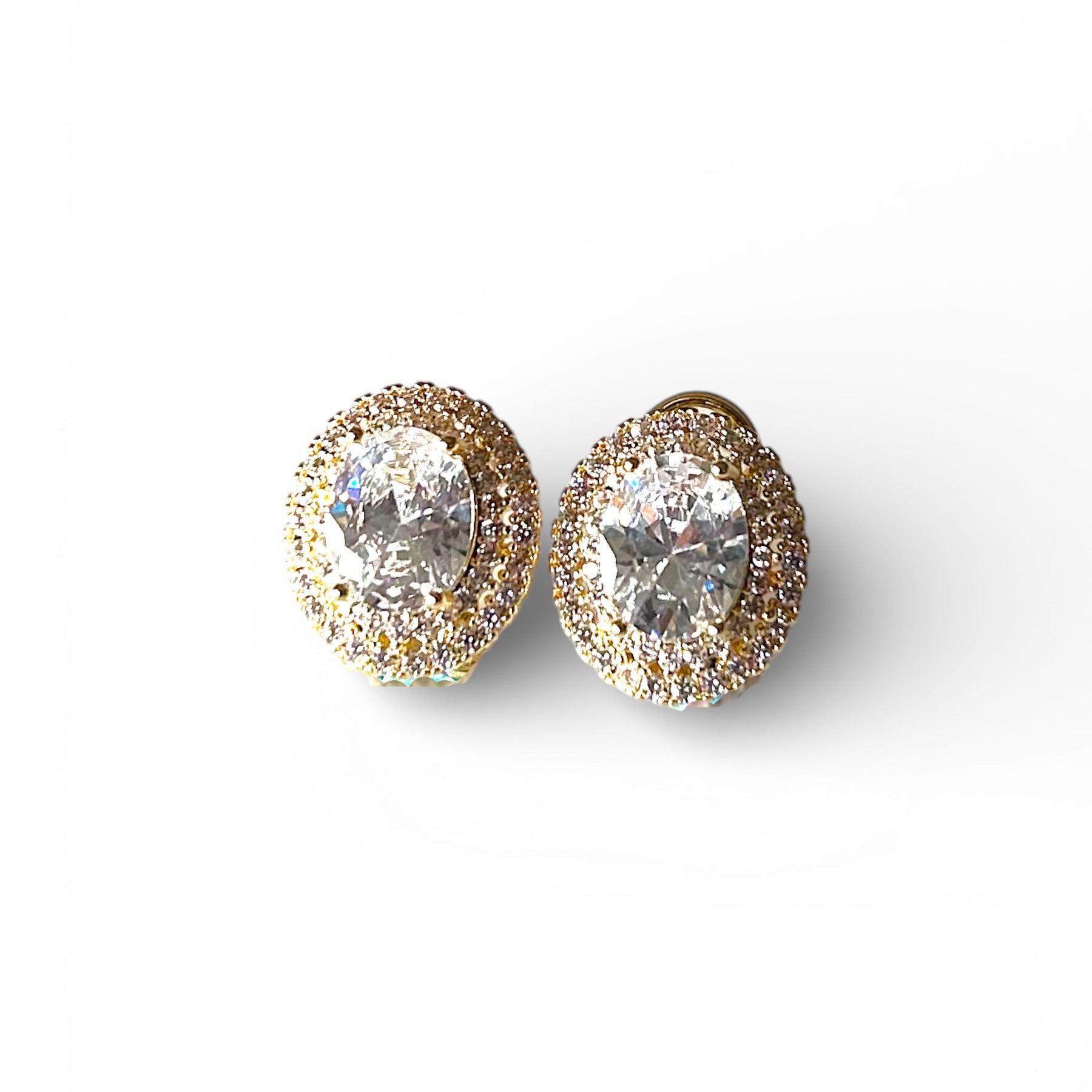 Nämä säihkyvät korvakorut huokuvat ajatonta glamouria ja hienostunutta eleganssia. Korujen keskiössä loistaa kirkas, huolellisesti hiottu kivi, jota ympäröi pienemmistä kivistä muodostuva säkenöivä kehys. Kultasävyinen istutus tuo kokonaisuuteen lämpöä ja ylellisyyttä, korostaen kivien briljanttia loistoa.